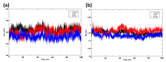 Fig. 5: Post MD analysis of the protein-ligand complexes (a)SASA (b) Radius of gyration (Rg) of the protein when bound to the ligands control (X6D), 1830, and 94381