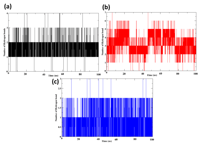 Fig. 6: Number of the hydrogen bonds of the protein-ligand complexes for (a) control (X6D) (b) 1830, and(c) 94381