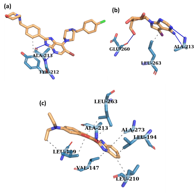 Fig. 7: Interaction analysis of the protein-ligand complexes for (a) control (X6D) (b) 1830, and (c) 94381