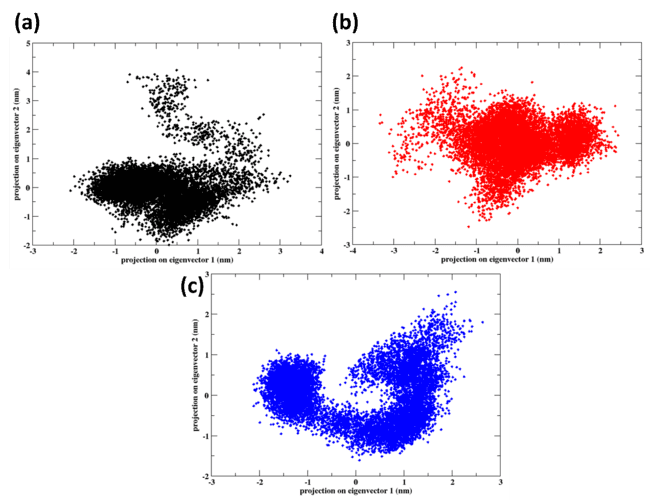 Fig. 8: PCA of the protein-ligand complexes for (a) control (X6D) (b) 1830, and (c) 94381