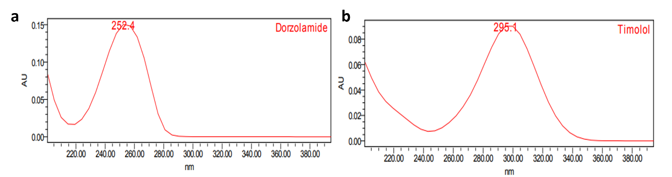Based on the UV absorption characteristics, 253 nm was selected as the detection wavelength for dorzolamide hydrochloride (DZH) and 295 nm for timolol maleate (TIM) [12].