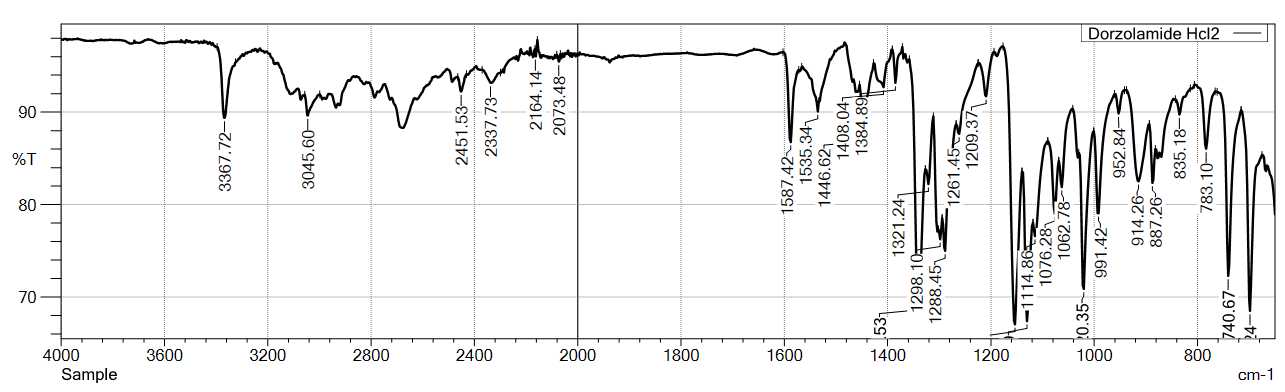 The FTIR spectra of DZH standard (USP) and sample of active pharmaceutical ingredient (api) showed characteristic peaks at 3369.65/3367.72, 3045.60, 2451.53, 2285.65/2337.73, 2007.90/2073.48, 1587.42, 1535.34, 1446.62, 1384.89, and 1321.24 cm⁻¹, confirming the identity of DZH.