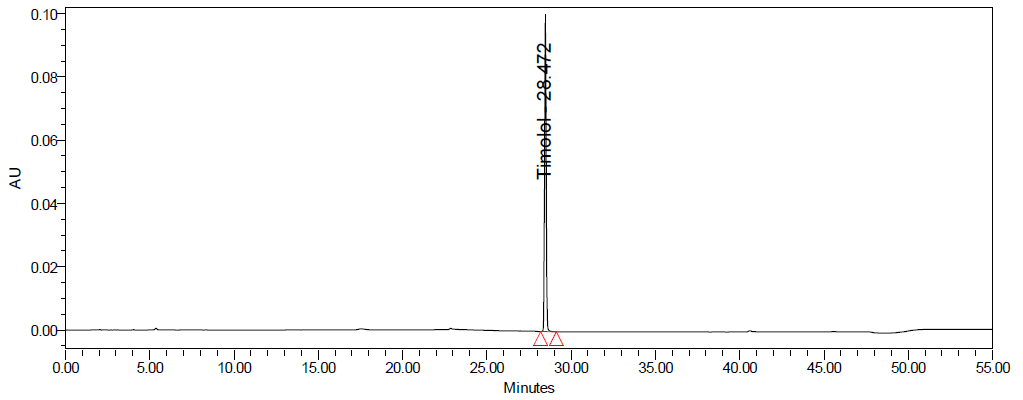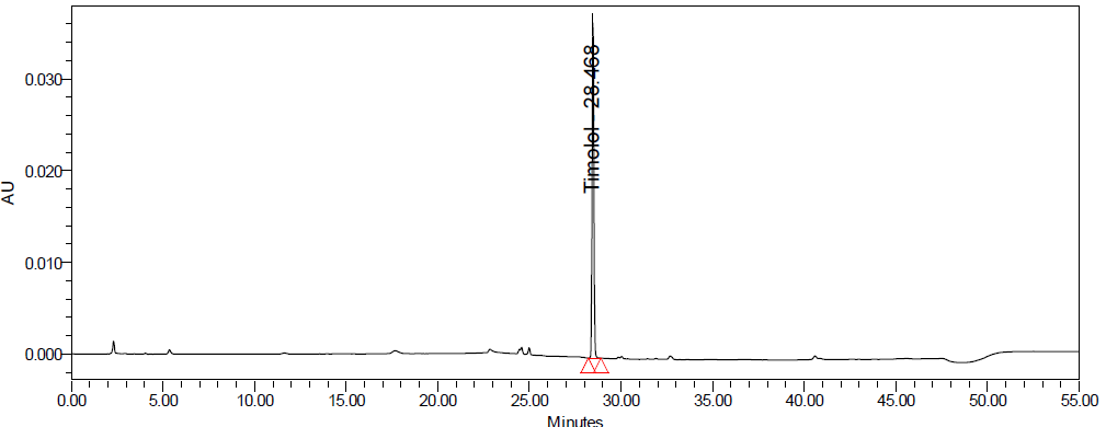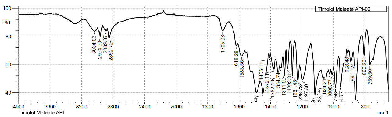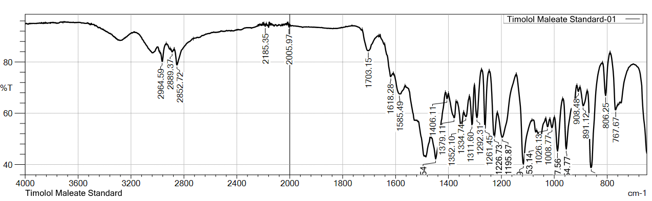 Similarly, the FTIR spectra of TIM standard (USP) and sample of api showed characteristic peaks at 2964.59, 2889.37, 2852.72, 1703.15/1705.08, 1618.28, 1585.49/1583.56, 1406.11, and 1379.11 cm⁻¹, confirming the identity of TIM.