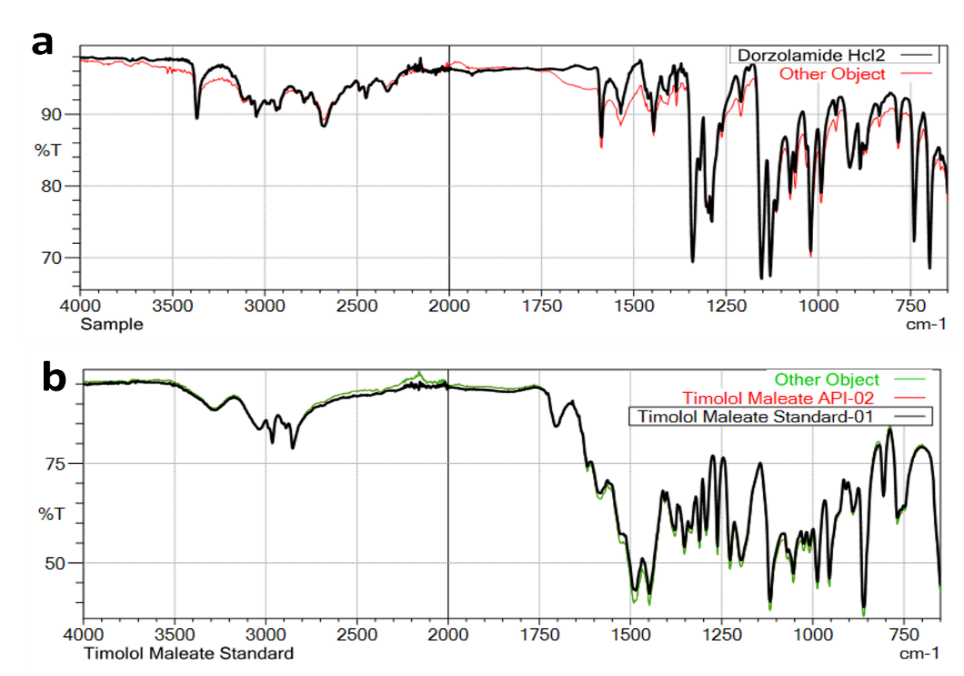 A Novel, simple, sensitive, precise, accurate, and robust RP-HPLC method has been developed and validated for the simultaneous estimation of DZH and TIM in ophthalmic formulations. The method is superior compared with others and provides good resolution between the two active ingredients and their degradation products as per the USP, BP, and Ph. Eur. The validation studies demonstrate that the method is specific, linear, precise, accurate, and stability-indicating as per the ICH guidelines. The developed method can be effectively applied for routine quality control analysis of DZH and TIM in their combined ophthalmic formulations and bulk dosages. The stability-indicating nature of the method makes it particularly suitable for stability studies and for the analysis of samples that may contain degradation products. FTIR (Fourier Transform Infrared) spectroscopy is indeed used to compare dorzolamide hydrochloride (DZH) and timolol maleate (TIM), both in their standard forms and in a sample to identify similarities and differences in their molecular structures. This technique helps confirm the identity of the api and assess the purity and stability of the pharmaceutical formulation.