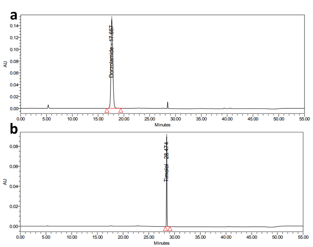 Several analytical methods like (ultraviolet) UV spectroscopy [6], RP-HPLC [7], and ultra-performance liquid chromatography (UPLC) [8] have been reported in the literature for the estimation of dorzolamide hydrochloride (DZH) and timolol maleate (TIM) either alone or in combination with other drugs. However, there is limited information available on stability-indicating analytical methods for the simultaneous estimation of DZH and TIM in ophthalmic formulations. Therefore, this study focuses on developing and validating a robust, specific, and sensitive RP-HPLC method for the simultaneous estimation of these active ingredients in their combined dosage form, along with identification using infrared spectroscopy.