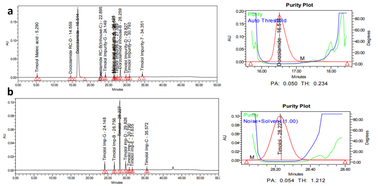 Objective: This new reverse phase high-performance liquid chromatography (RP-HPLC) method demonstrates superiority over the methods found in official monographs, as it is not included in the United States Pharmacopeia, British Pharmacopeia, or European Pharmacopeia (USP, B. P, Ph Eur). It effectively separates all impurities with excellent resolution from the main analyte, and the spectral purity of the main analyte was confirmed through peak purity analysis in specificity studies involving spiked sample solutions and degradation studies. According to the British Pharmacopeia, impurities B and D are associated with dorzolamide hydrochloride (DZH), while timolol maleate (TIM) includes Impurity G. The USP lists maleic acid and DZH-related compounds B and D for DZH, along with G, B, and D for TIM.