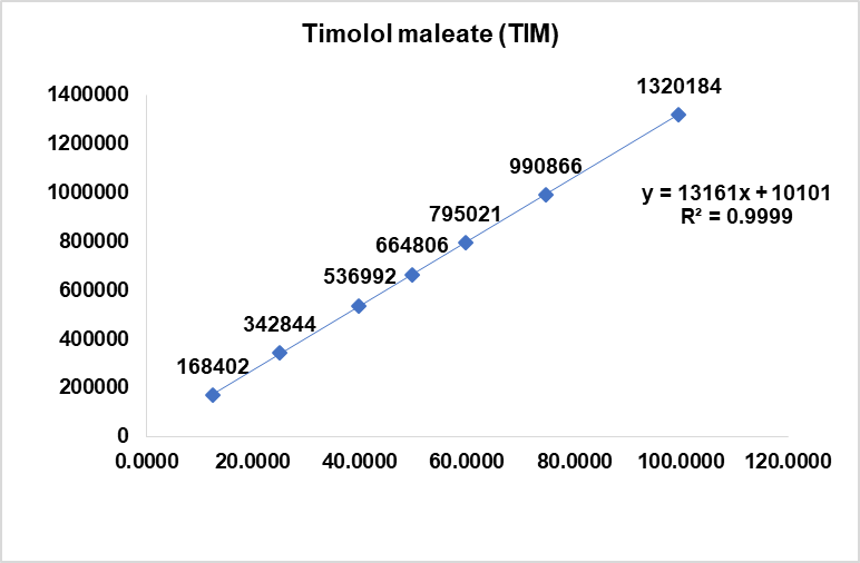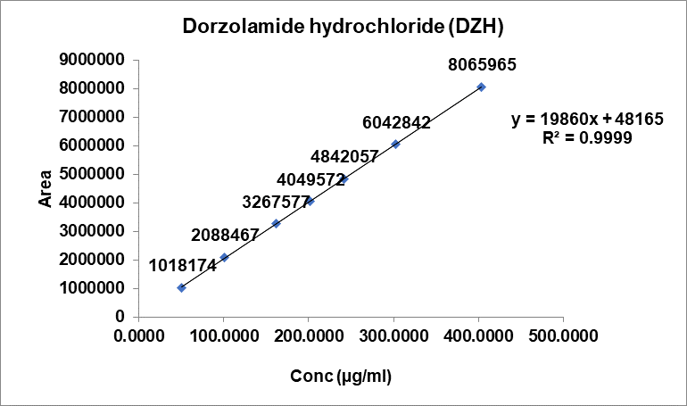 Linearity was evaluated by analyzing standard solutions at concentration levels ranging from 50-400 μg/ml for DZH and 12-100 μg/ml for timolol maleate. Calibration curves were plotted with concentration versus peak area, and the correlation coefficient, slope, and y-intercept were calculated [20].