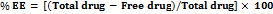 To determine drug encapsulation, the SNEDDS was centrifuged at 15,000 rpm for 3 h at room temperature. The clear supernatant was collected, mixed with ethanol to break vesicles, and analyzed using UV spectrophotometry at 275 nm. Entrapment efficiency was calculated using a standard formula.