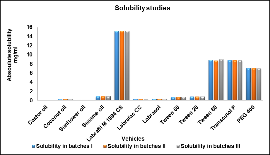 To design effective SNEDDS formulations, the solubility of the methanolic extract was evaluated in a range of oils, surfactants, and co-surfactants. Each extract was thoroughly mixed with individual vehicles, followed by vortexing for 15 min. The mixtures were then placed in a water bath and gently agitated at 25 °C for three days to ensure proper interaction. After incubation, the samples were centrifuged at 3500 rpm for 15 min. The clear supernatant was collected, appropriately diluted, and analyzed using a ultra-violet (UV)-visible spectrophotometer at a wavelength of 275 nm. This procedure was repeated three times to ensure accuracy, and the average solubility values were recorded (table 5) [11, 12].