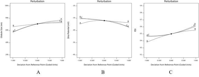 Fig. 5: Perturbation plot for globule size (A), Zeta potential (B), PDI (C), the polynomial equations generated were used to create 2D contour plots and 3D response surface plots, which closely matched and confirmed the results predicted by the equations