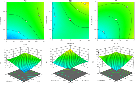 A similar mutual interaction between oil-surfactant and oil-co-surfactant was observed for the PDI, where an increase in all factors led to a rise in PDI values. The self-interactions of each factor were relatively weak (fig. 8).