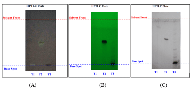 First, the sample was evaporated, and the residue left behind was dissolved in 1 ml of methanol. This solution was then passed through a 0.45 μm membrane filter to eliminate any solid particles. The clear filtrate obtained was used for HPTLC fingerprint analysis. To prepare the derivatizing reagent, 10 ml of glacial acetic acid was mixed with 0.5 ml of anisaldehyde, 85 ml of methanol, and 5 ml of concentrated sulfuric acid (98%). For the chromatography, the mobile phase consisted of toluene, methyl acetate, and methanol mixed in a ratio of 8:2:0.5 (v/v). Before starting the development, the chamber was saturated with this mobile phase for 30 min to promote better separation. After the chromatographic run, the sample spots were observed under UV light at 254 nm and 366 nm, as well as under visible light at 540 nm, for further visualization.