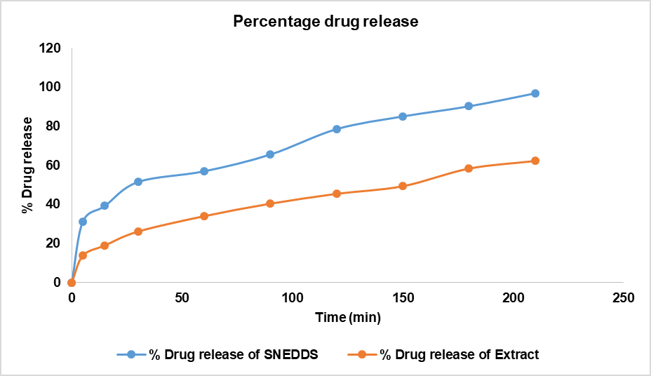 The collected samples were filtered and analyzed for drug concentration at 207 nm using a UV-visible spectrophotometer, with appropriate blanks used for comparison (fig. 11). The maximum amount of drug release is calculated as 96.89% for SNEDDS and 62.28% for extract.
