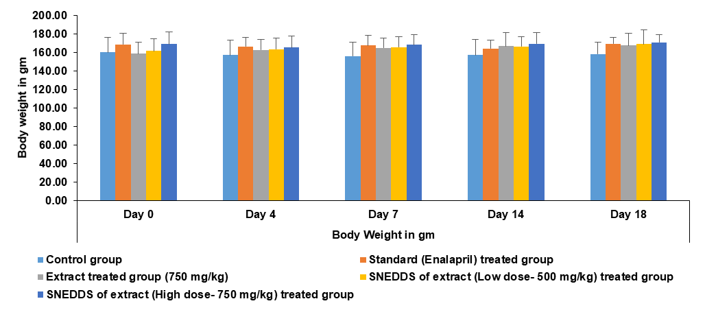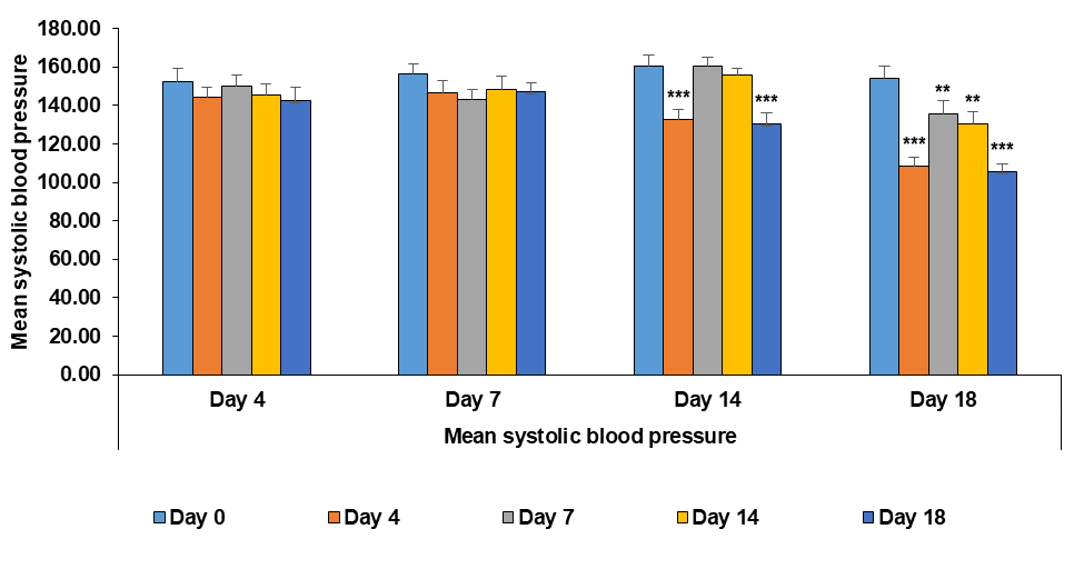 The symbols*, **, and *** represent statistically significant differences compared to the control group, with p-values of<0.05, <0.01, and<0.001, respectively. On day 14, significant differences were seen in the standard treatment group (Enalapril) and the high-dose SNEDDS extract group (750 mg/kg), while the other two groups showed no significant changes. By day 18, all treatment groups demonstrated significant differences compared to the control (fig. 14). The standard drug and the high-dose SNEDDS extract groups showed the most pronounced effects, whereas the extract alone and the low-dose SNEDDS group (500 mg/kg) showed a slightly milder response. These results indicate that even at higher doses, the test drug did not cause any harmful effects, suggesting that it is both safe and effective.