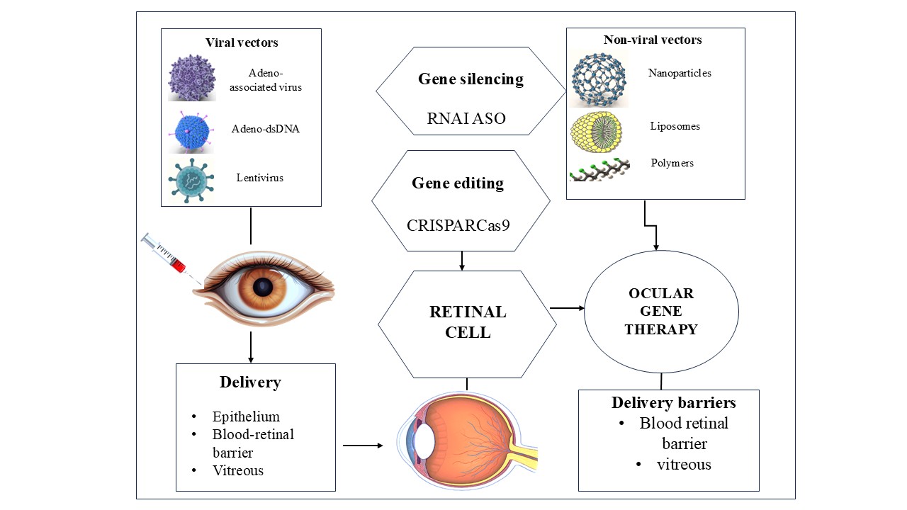 Gene therapy is a promising approach for treating ocular diseases using two main strategies: gene silencing to block harmful proteins and gene insertion or editing to restore protein function. It’s being explored for conditions like AMD and retinal disorders. Delivery involves viral/non-viral vectors, CRISPR-Cas9, and epigenetic tools like RNAi and ASOs [58, 59], which are also depicted in fig. 1. Adeno-associated virus (AAV) vectors uniquely align with ocular gene therapy goals due to their cellular tropism and delivery advantages. When administered via intravitreal injection, AAV serotypes such as AAV2 and AAV8 are adept at crossing the inner limiting membrane to reach retinal ganglion cells, photoreceptors, and the retinal pigment epithelium (RPE), enabling targeted gene expression with minimal systemic exposure. Moreover, advances in capsid engineering, including surface loop modification and directed evolution, have produced vectors with enhanced retinal tropism and decreased neutralizing antibody binding, improving transduction efficiency in research, including non-human primates. Subretinal delivery, though more invasive, provides direct access to the RPE and photoreceptors, improving transduction precision—this method underpins the approval of therapies like voretigeneneparvovec for LCA. Beyond viral strategies, non-viral mechanisms (e.g., RNA interference, antisense oligonucleotides) also benefit from the ocular immune-privileged status, reducing immunogenicity and facilitating sustained gene silencing without altering genomic DNA [60].