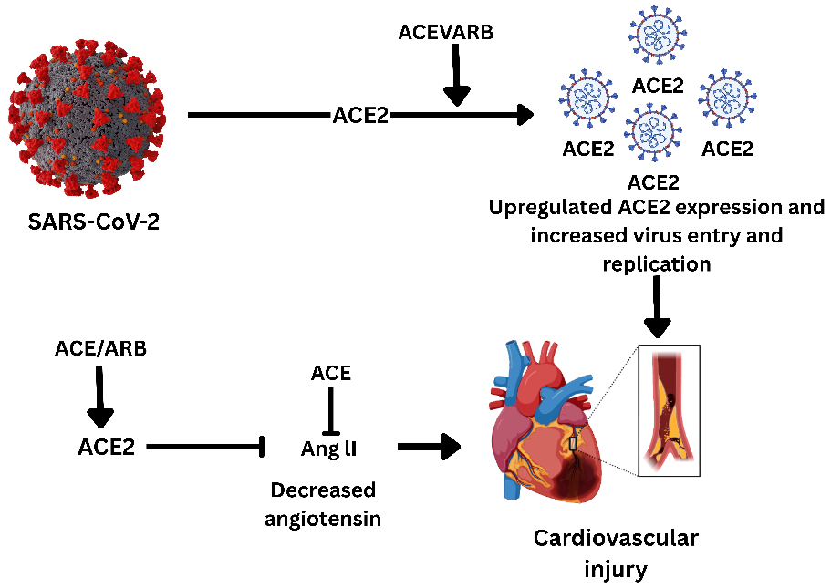 Fig. 1: Schematic representation of the impact of ACE inhibitors (ACEi) and angiotensin receptor blockers (ARBs) on SARS-CoV-2 infection and cardiovascular injury. SARS-CoV-2 uses the ACE2 receptor for cellular entry, and the use of ACEi/ARB drugs leads to upregulation of ACE2 expression, increasing viral entry and replication. This exacerbates cardiovascular injury by further promoting viral invasion and myocardial damage. In contrast, ACE inhibitors decrease angiotensin II levels, which may have protective effects against cardiovascular complications