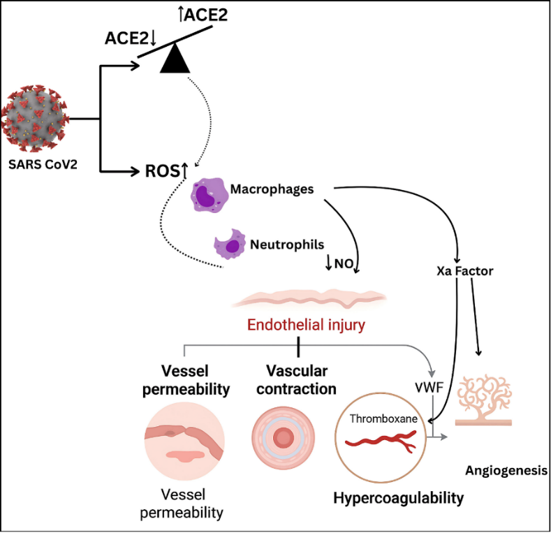 Fig. 2: Pathophysiological effects of SARS-CoV-2 on endothelial function: The virus induces ROS production and ACE/ACE2 imbalance, promoting macrophage and neutrophil recruitment, NO depletion, endothelial injury, hypercoagulability via thromboxane and VWF, and subsequent platelet activation. Factor Xa contributes to IL-6-driven inflammation and pathological angiogenesis, leading to thrombotic complications in patients with COVID-19