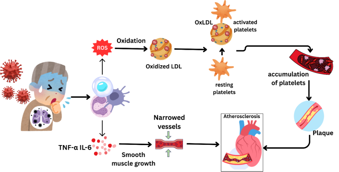 The cardiovascular complications observed in COVID-19 patients are driven by a multifaceted interplay between direct viral injury, immune-mediated inflammation, and endothelial dysfunction. The cytokine storm is triggered by excessive release of proinflammatory cytokines such as TNF-α, IL-1, and IL-6, which increase systemic and cardiac inflammation. Elevated cytokine levels induce endothelial activation, increase vascular permeability, and promote a hypercoagulable state, leading to microvascular dysfunction and the formation of microthrombi within coronary vessels [25]. This cascade disrupts coronary circulation and disrupts the transport of nutrients and oxygen to the heart muscle, thereby contributing to myocardial injury, cardiac arrhythmia, and cardiac incapacity [26].
