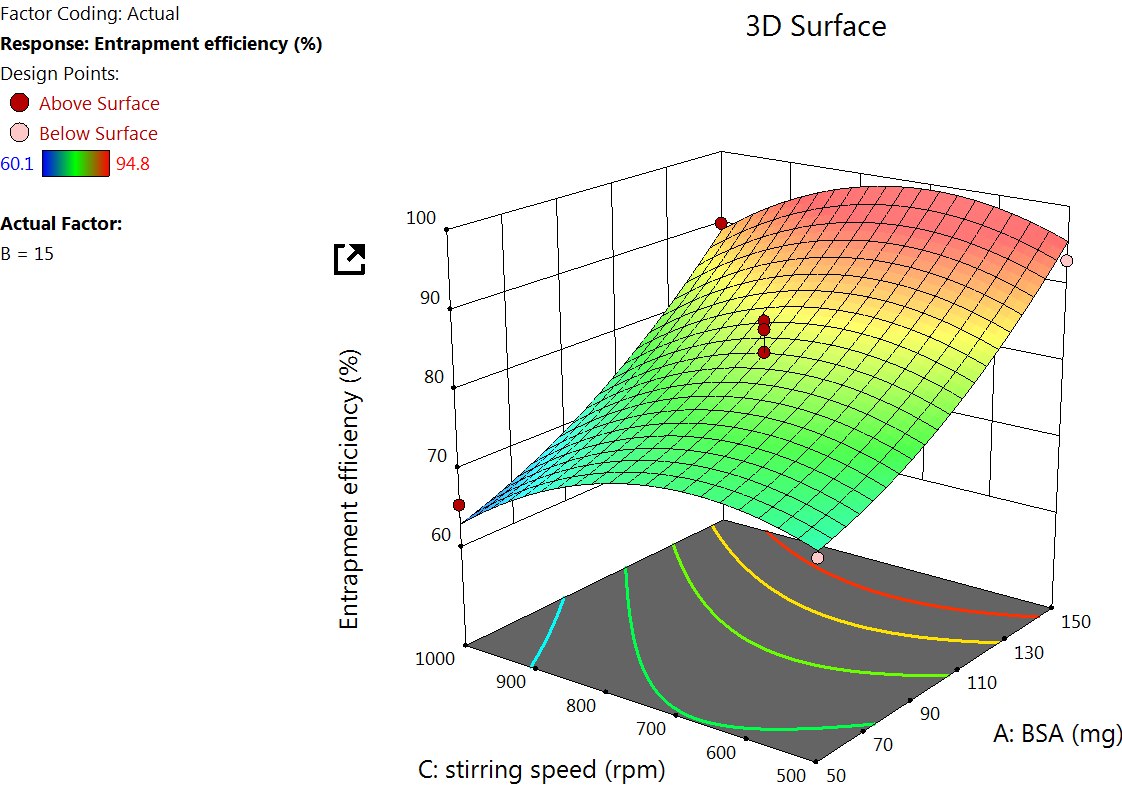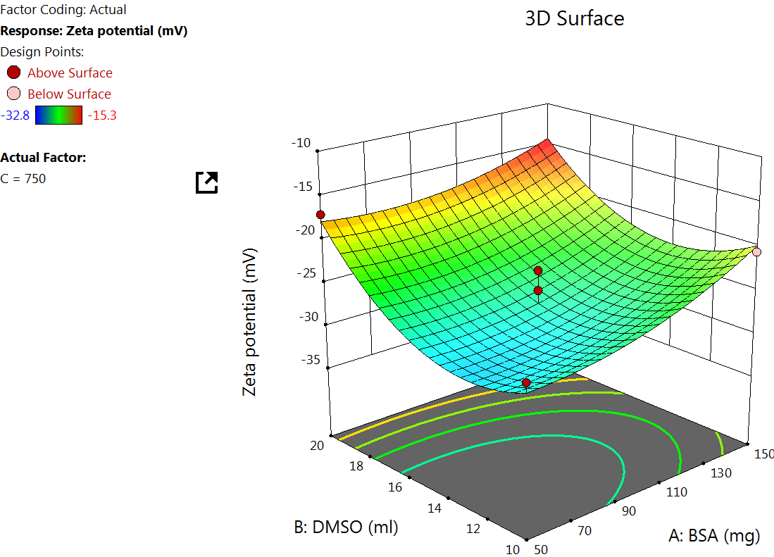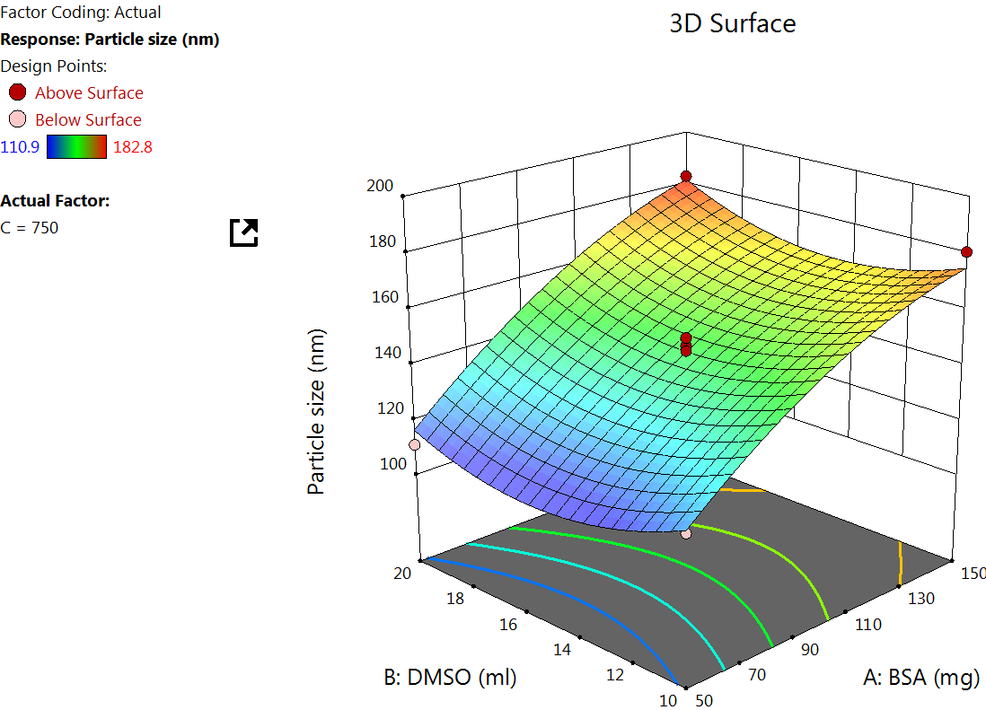 The Quadratic model table for zeta potential (table 3) showed an F value of 8.26 and a P value of<0.0055, indicating a significant response. An increase in the concentration of BSA increases the zeta potential, which is because higher BSA concentration tends to increase the availability of surface amino and carboxyl groups, which can lead to more negative or positive zeta potential, depending on the pH of the medium [39] (fig. 3).