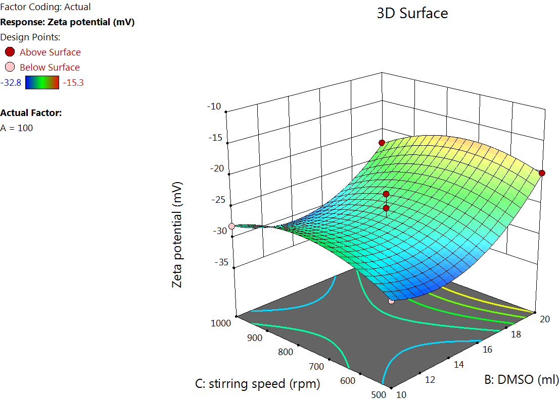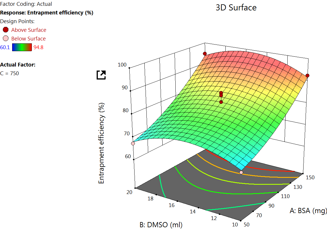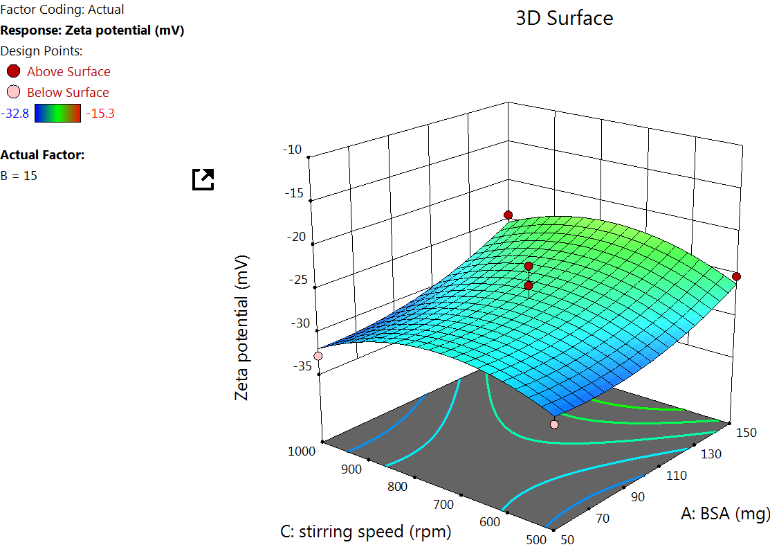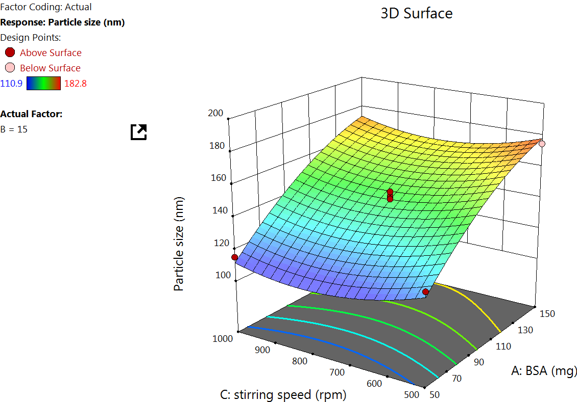 The Quadratic model table for zeta potential (table 3) showed an F value of 8.26 and a P value of<0.0055, indicating a significant response. An increase in the concentration of BSA increases the zeta potential, which is because higher BSA concentration tends to increase the availability of surface amino and carboxyl groups, which can lead to more negative or positive zeta potential, depending on the pH of the medium [39] (fig. 3).