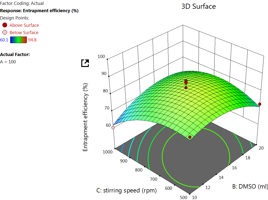 The EE% for 17 formulations was found to be from 60.1±9.01% to 94.80±9.14% (table 2). A major goal of the current study is to maximize the entrapment of the drug into the NPs to increase the drug concentration at the site of action. The quadratic equation for EE% is