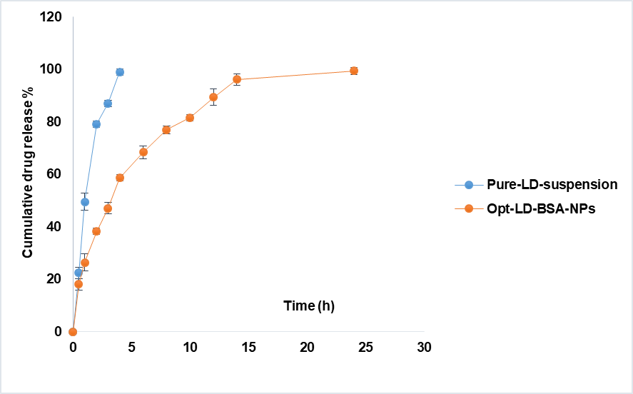 The study used the dialysis bag technique to track drug-release patterns from LD-BSA-NPs. The release patterns were examined at a pH of 5.5 to mimic the acidic tumor microenvironment. The dialysis bag (12–14kDa MWCO, Spectra/ProR4 Dialysis Membrane; Spectrum Laboratories, Inc., Rancho Dominguez, CA) was filled with 1 mg of the drug in its free form or a formulation volume equivalent to 1 mg of the drug. Dialysis bags were then submerged in 200 ml of acetate buffer, pH 5, containing TritonX-100 (1%), and kept in a shaking water bath (AZZOTA corporation, USA). Drug samples were withdrawn and analysed at 255 nm using a spectrophotometric technique (Spectro UV-VIS double beam, Lab India 3200) [31].