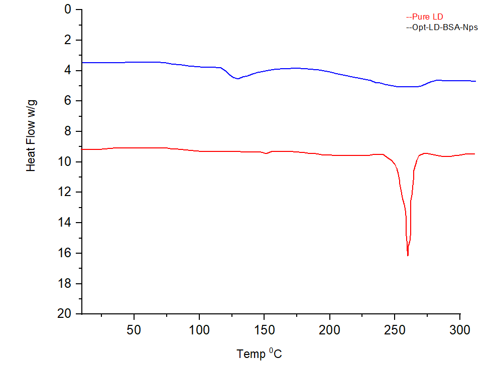The DSC thermograms of pure LD and Opt-LD-BSA-NPs are shown in fig. 6. The DSC curve of LD exhibits an exothermic peak at a peak temperature of 270 °C, corresponding to its melting point. As per the DSC graph of Opt-LD-BSA-NPs, the characteristic exothermic peak of LD was observed with minimal intensity and shifted to a lower temperature range. This indicates the conversion of the crystalline nature of LD to an amorphous form, which ensures better stability. Furthermore, it also confirms that LD was entrapped in BSA-NPs. Reported findings have suggested that with an increase in the amorphous nature of the therapeutic system, a corresponding increase in the efficiency of delivery is observed by Abdelwahed et al. in 2006.