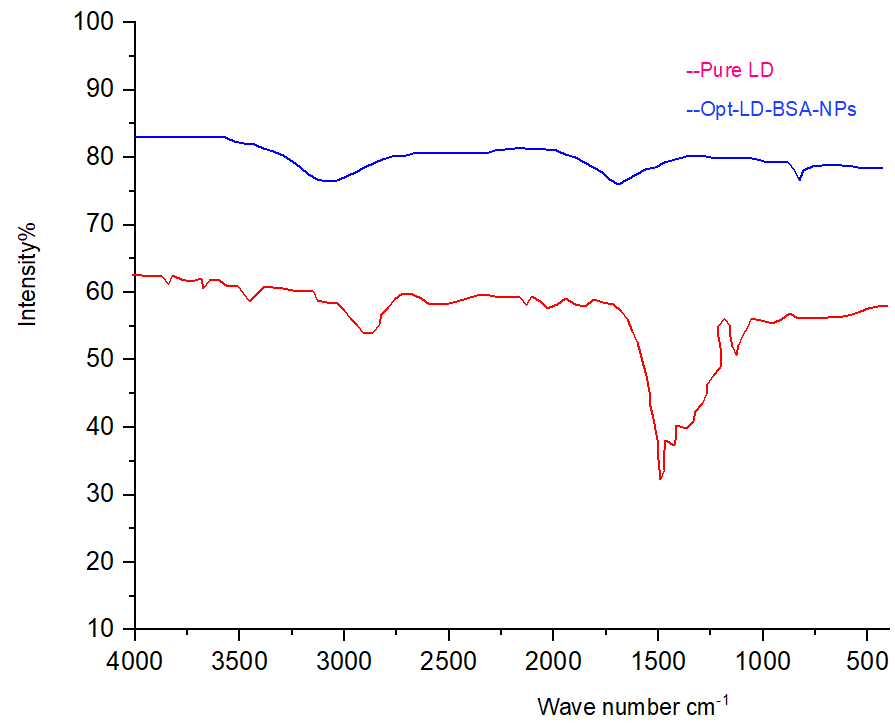The FTIR of pure LD and Opt-LD-BSA-NPs are described in fig. 7. The Pure LD FTIR spectrum reveals key functional groups, with amide absorption around 1600–1700 cm⁻¹, aromatic ring peaks near 1500 cm⁻¹ and 3000 cm⁻¹, and broad-NH/-OH bands in the 3200–3500 cm⁻¹ range the FTIR spectrum of the Opt-LD-BSA-NPs revealed distinct shifts in the amide bands, confirming successful drug encapsulation and stable protein interactions.