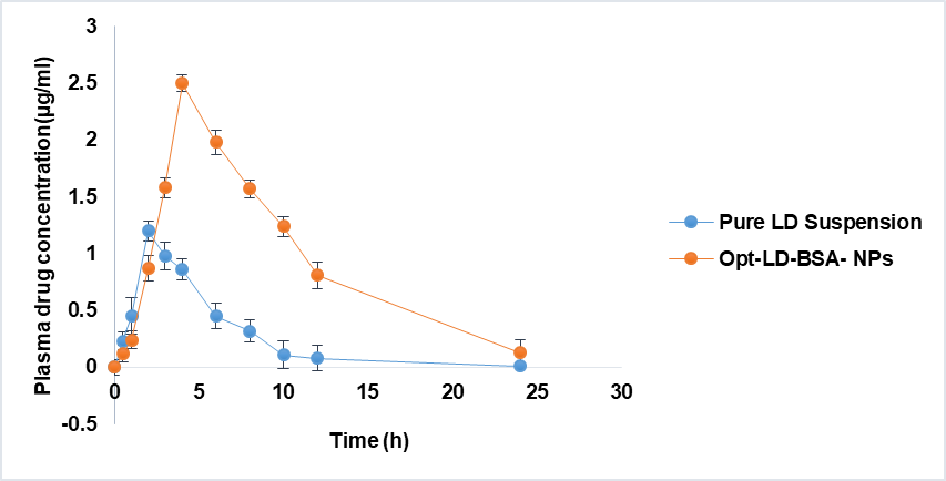 Similarly, table 5 depicts the pharmacokinetic parameters Cmax, AUC, AUMC, and MRT of Opt-LD-BSA-NPs. From table 5, it can be perceived that the Cmax value for Opt-LD-BSA-NPs (2.5 µg/ml) was significantly higher than that of the LD suspension (0.98 µg/ml). In the same way, the t½ was rapid for Opt-LD-BSA-NPs (12 h), when compared to pure LD suspension (4 h). The AUC for Opt-LD-BSA-NPs is 22.47 µg/ml. h, which is 3 times more than the pure LD suspension (6.3025µg/ml. h).