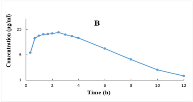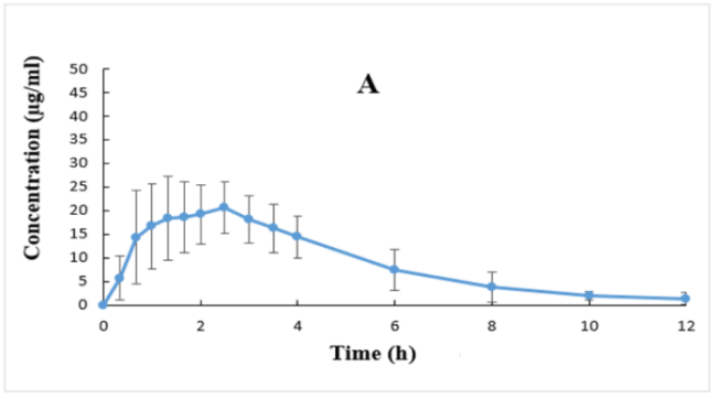 The method validation was accurate, specific, selective, sensitive, and precise based on the current recommended FDA bioanalytical method validation guidance [30]. Moreover, ibuprofen’s plasma concentration ranges from 0.1-100 µg/ml applied in this investigation were quite enough for covering the ranges of the resulted ibuprofen’s plasma levels, as illustrated in fig. 1.