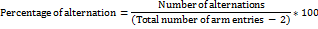 Rats with minor alterations were used to test short-term memory via spontaneous alternation behavior. In brief, each animal was positioned at one end of the wooden "Y" maze and allowed to explore for eight minutes. A visual record was made of the number of arm series entries, including potential returns into the same arm. Rats on overlapping triplet sets were utilized to test the alternation by entering each arm one after the other. An hour before the test, the rats received their respective medications. Between studies, the arms were thoroughly cleansed to eradicate any remaining odors. It was determined how many arm entries there were overall during the testing time. Furthermore, the proportion of alternation was calculated using the following formula: