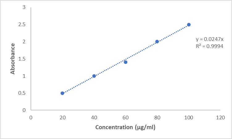 A standard calibration curve was plotted between EDN concentration in (µg/ml) and the absorbance in PBS of pH 7.4 solution. R2 regression coefficient value observed as 0.9994.