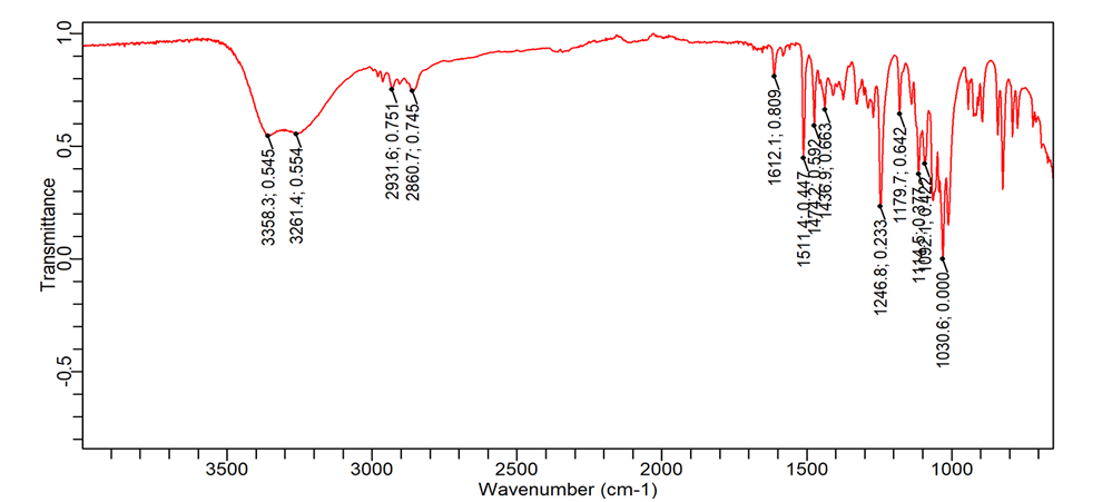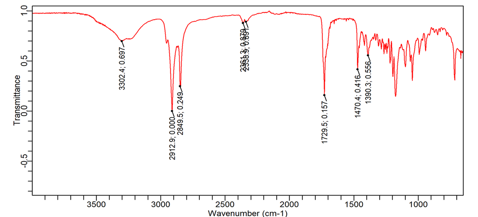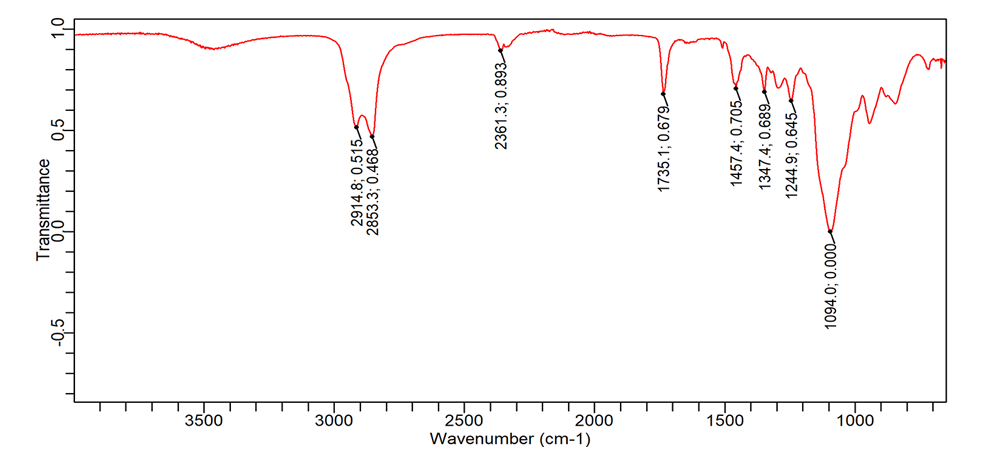 FTIR studies were conducted as per the specifications mentioned in the methods column. Significant peaks of EDN observed at wavelength 1094 cm-1, 1457 cm-1, 2361 cm-1, 2914 cm-1 present in formulation. All the peaks present in the drug are represented in the formulation of SLN.