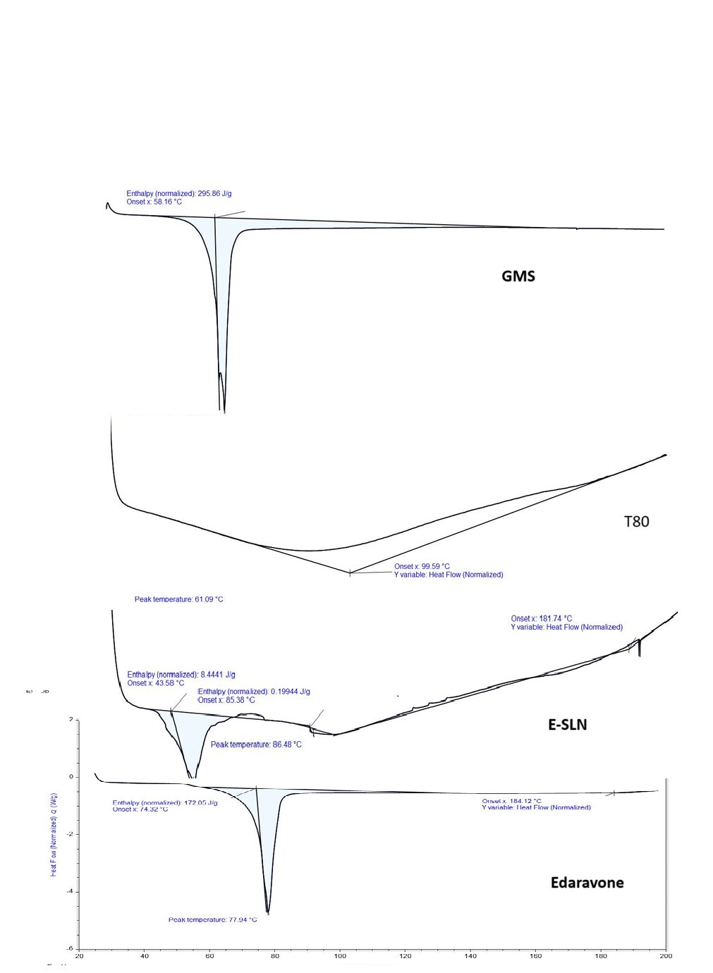Fourier transform infrared spectroscopy (FTIR): The FTIR spectra of pure EDN, Excipients, and optimized formulations were recorded in the region of 4000-400 cm-1 (FTIR Spectrophotometer, Jasco-Japan). The transparent pellets of these samples were prepared by the pressed pellet technique (potassium bromide), and the recorded spectra were interpreted for the possible chemical interactions.