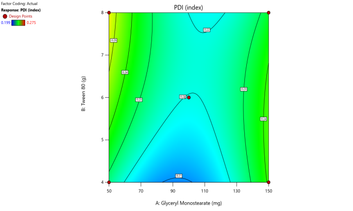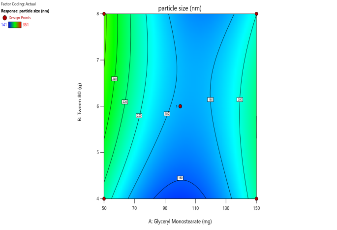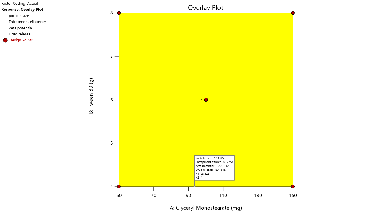Various process parameters like temperature, stirring speed, and sonication time are finalized by the melting point of lipids, i. e., 58-60 °C. Stirring speed of 12400 RPM as per the literature, and the sonication time was decided by the measurement of particle size and PDI as 5 min. The present study was carried out with the finalized process parameters to calculate the CQA with the solvent evaporation technique. Design expert software with the build information of response surface randomized CCD with 13 runs in no blocks was performed to maintain the quality of formulation development.