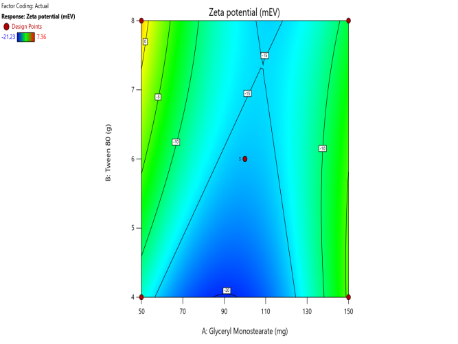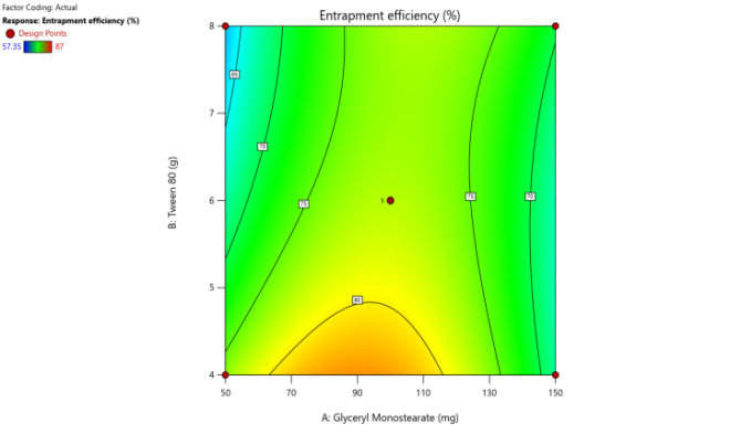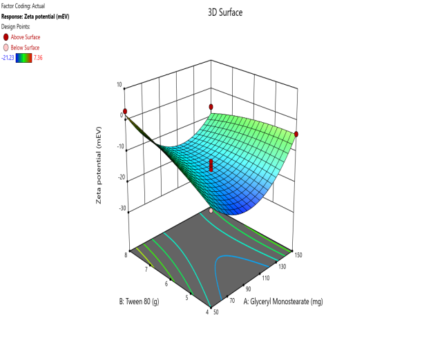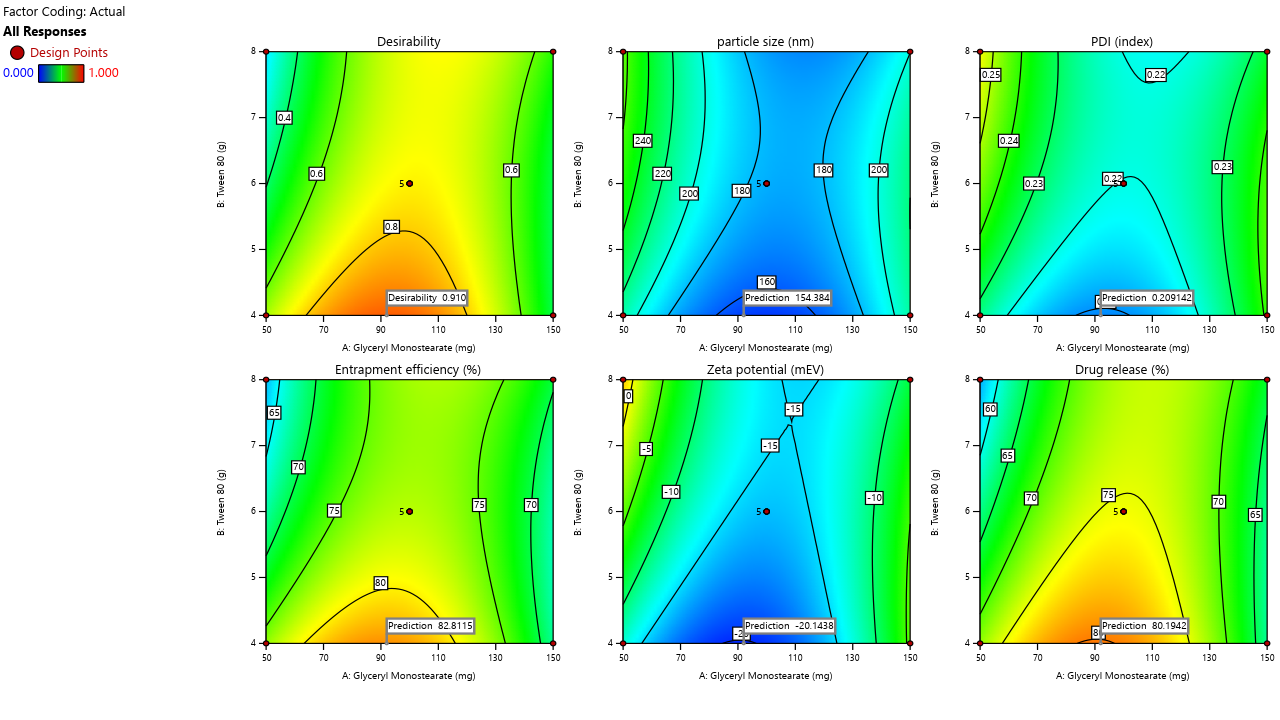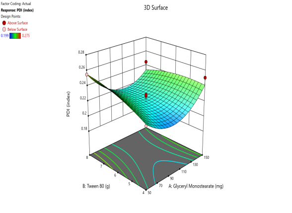 Optimization of formulation was done by the secondary order level of study conducted by the central composite study design with two factors and five levels of study performed by the design expert V13 software trial version of 13.0.5. Two selected independent variables were studied at five different levels, like -1.414,-1,0,+1,+1.414, where 1.414 is indicated as the value of Alpha, which is the distance between the center point and the star point. A total of 13 experimental runs were performed to accelerate formulation studies, which include four factorial points, four axial points, and five replicated center points used to assess the data with statistical significance. The optimized formulation was selected based on a complete statistically significant analysis by verifying the p-value, Analysis of Variance (ANOVA) studies, fitness of the model among the linear, two-factor interaction, and quadratic analyses due to the correlation coefficient r2, adjusted r2, and predicted r2 as quality indicators. Larger f-value and p-value less than 0.05 are considered to be statistically significant formulation [16]. 3D (3-dimensional) response surface plots explain the interaction between solid lipid and surfactant and tween 80 molecules. One more criterion to select the optimized formulation was the desirability function by the predetermined constraints, like particle size is minimum, EE Maximum, Drug release Maximum, and Zeta potential within the range of study. Final optimized formulation used for the evaluation, stability studies, and in vivo animal model studies to determine the therapeutic effect of the drug [17].
