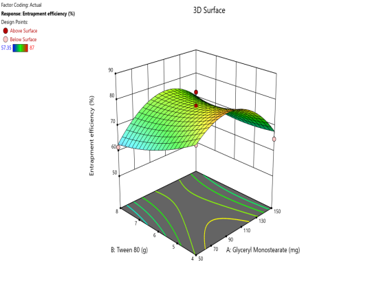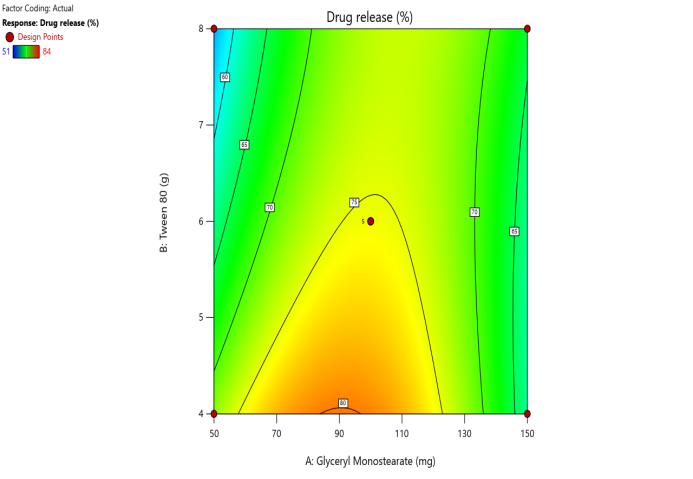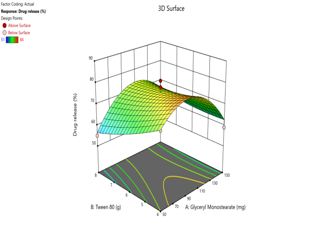 Drug release studies are showing the f-value of 11.99 with p<0.005 is significant. Lack of fit has 1.7 f-value and p>0.005 shows not significant. Polynomial equation depicts the negative effect of surfactant when comparing with the GMS. DR increased with the less amount of surfactant concentration. 3D and Contour plots reveal the suggested decision to conclude the remarks.