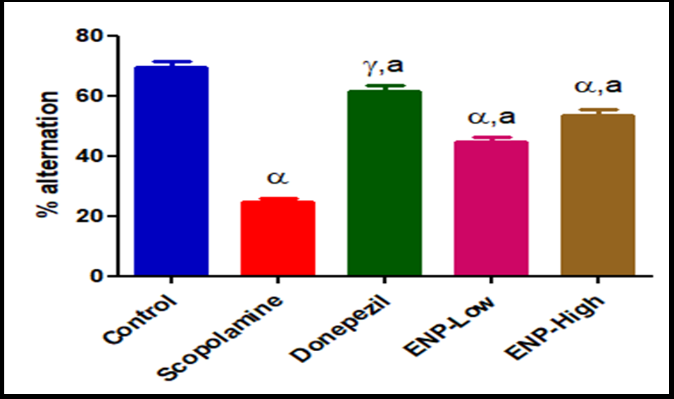 Fig. 8: Protective effect of ENP on scopolamine-induced memory and behavioral impairment in the Y-maze test, #Bars with "α" are significantly different from the control, #Groups labeled only "a" are not significantly different from each other.