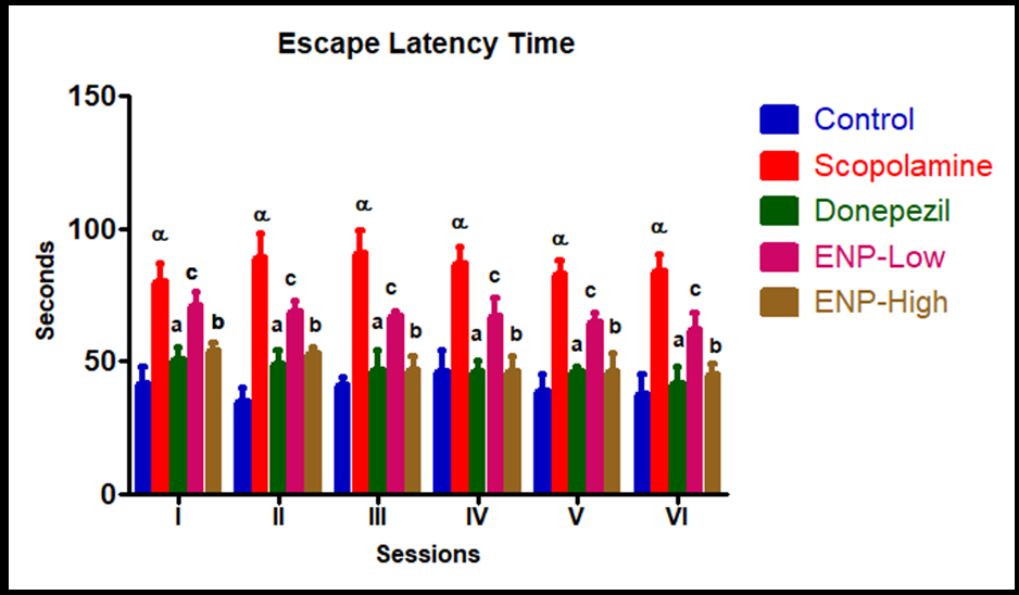Fig. 9: Effect of ENP on the acquisition of spatial memory by the morris water maze test, #For each session, Scopolamine bars marked α are significantly different from control and other groups, #within each session, bars marked a, b, c indicates which groups' escape latency times are significantly different from others, #If bars share a letter, their means are statistically similar for that session