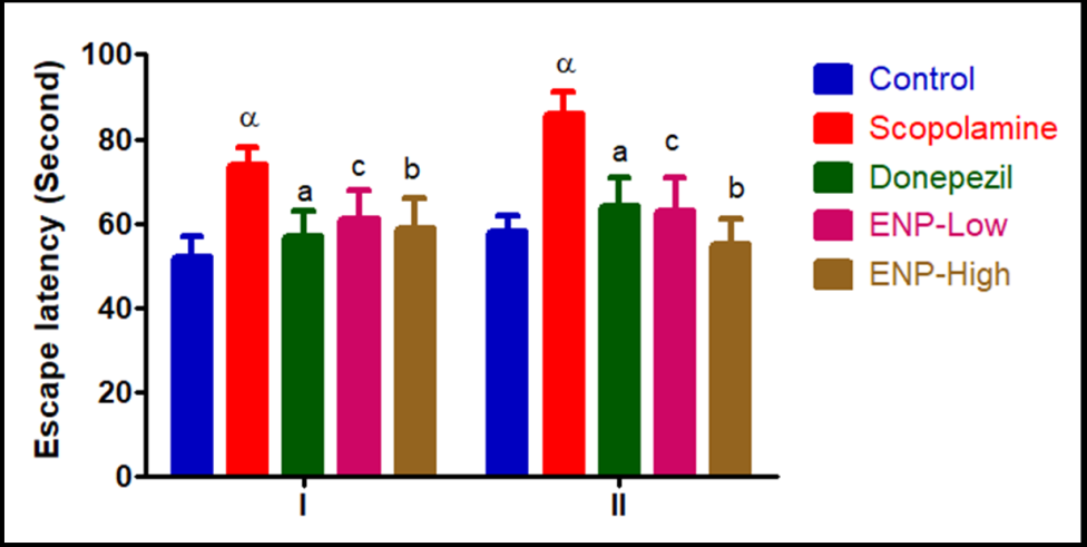 Morri’s water-maze test was used to investigate ENP's influence on memory enhancement as well. The animals were trained in four daily attempts to find the platform. The acquisition study ran for six days before scopolamine injection. Recorded as escape latency in seconds, their spatial learning scores were the findings of the experiment, indicating that the scopolamine-administered group showed a notable drop in escape latency relative to the control (fig. 10).