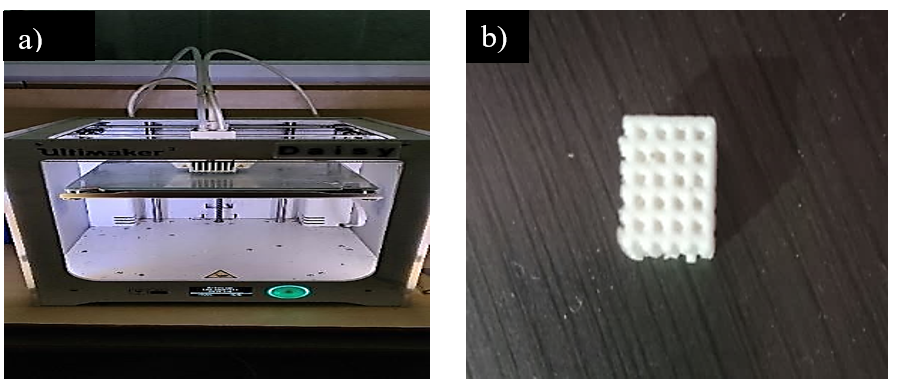 Fig. 1: a) 3D printer b) Fabricated scaffold