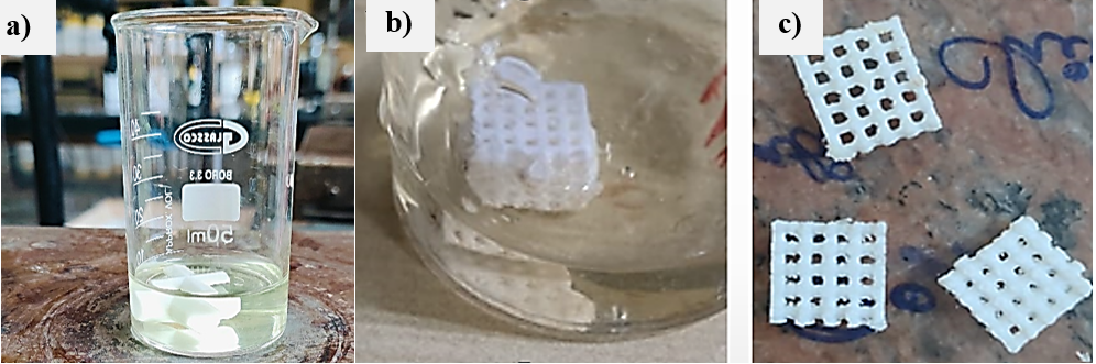 The scaffold was fabricated using fused deposition techniques. The initial step of fabrication starts with using a 3D porous scaffold design by using computer aided drug design (CADD). The scaffold design was prepared using Rhinoceros software and simulated using AUTODESK software [10, 11]. It is intended to create porous hexagonal scaffold structures. This scaffold model was prepared and analyzed in two different pore sizes (300 µm and 800 µm, respectively) according to ASTM standards. The printing used in this study is the ENDER 5 PLUS 3D printer, which is set to head size 0.4 mm, printer speed 40 mm/s, layer thickness 0.2-0.4 mo and nozzle temperature 200 °C, construction temperature 60 °C. After 3D printing completion, the scaffold was dried in room temperature before being taken off the printing bed [12].
