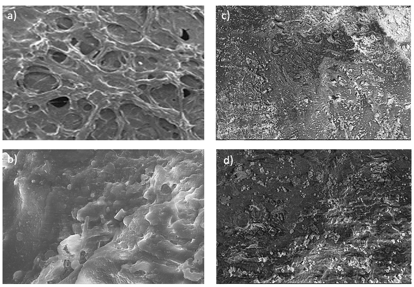 Fig. 3: SEM image (100x) for the scaffold a) and b) Uncoated scaffold, c) and d) Coated scaffold