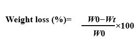 The degradation study aims to evaluate the behavior and biological activity of the scaffold by immersing it in dynamic SBF at pH 7.4. The SBF solution has similar human plasma ion levels that keeps stable under low-temperature storage (Nacl≤8.035g, NaHCO≤0.355g, Kcl≤0.225g, (Kâ 3H O) ≤ 0.23g, (Mgcl.6H O) ≤ 0.311g, 1M Hcl-39 ml, (Cacl)-0.292g, (NaS)-0.072g, [Tris-(CHOCH-)-(NH-)]-6.118 [24, 25]. The SBF solution was removed from the scaffolds before washing them with distilled water followed by room temperature drying for 48 h. Weigh the dry dock and measure its change from its weight prior to water application. The biodegradability of the stent is calculated by measuring the change in the weight of the stent over time. This weight change is calculated according to the below equation [26].