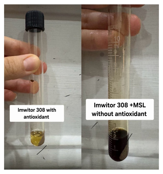 To evaluate the effect of the type of antioxidant on UV spectrophotometry absorbance of MSL. When we use a different type of antioxidant, we evaluate how its concentration and type affect the discolouration of MSL. n. The amount of antioxidant mixed with MSL in a 50% ratio is represented by the formula code F*, as shown in table 1.