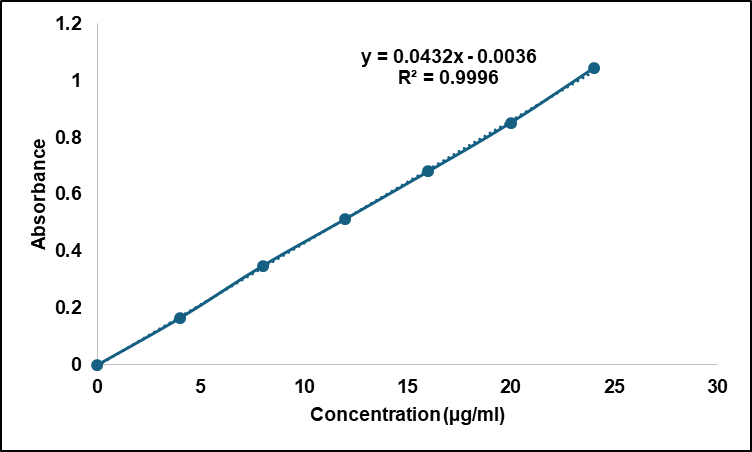 To study the spectral characteristics of Rubia cordifolia extract, ethanol was used as a solvent where 10 mg of accurately weighed pure drug sample was transferred to a 100 ml calibrated volumetric flask, dissolved and made up to the mark with ethanol to prepare a stock solution (100 µg/ml), from which different aliquots (0.4, 0.8, 1.2, 1.6, 2.0, 2.4 ml) were withdrawn and transferred into separate 10 ml calibrated volumetric flasks, then diluted to the mark with ethanol to obtain working standard solutions ranging in concentration from 4-24 µg/ml. The solutions were absorped and the absorbance of them is measured at the λmax of 417 nm using the UV-1900 Shimadzu spectrophotometer [13].