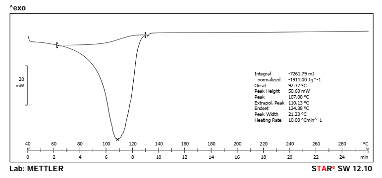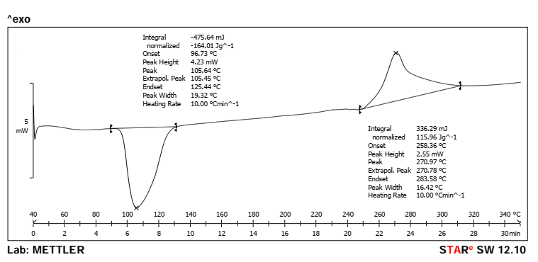 It was assessed by Differential Scanning Calorimetry (DSC) on a Mettler Toledo DSC 3+(Mettler Toledo India Pvt. Ltd., Mumbai, India) coupled with heat flux Module, and run at a temperature ramp of 10 °C/min. STARe software of the Mettler Toledo India Pvt. Ltd., Mumbai, India, was used to evaluate the thermal behavior and interactions between Rubia cordifolia extract and the excipients. Thus, samples were prepared at each concentration pure extract, physical mixture, and excipients of exactly 5.0±0.1 mg in aluminum crucibles with perforated lids; an empty crucible was used as reference. N2 (50 ml/min) was passed through the samples heated from 30 °C to 300 °C at 10 °C/min. The tests were repeated in triplicate (n=3). Thermal transitions of thermograms, such as onset, peak, and entset temperatures, and enthalpy (ΔH) were analyzed from the peak area [14].