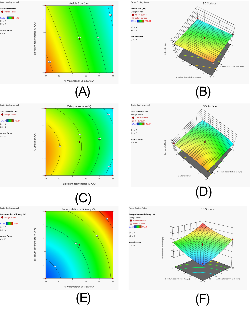 | A: Phospholipon 90 G (% w/w) | B: Sodium deoxycholate (% w/w) | C: Ethanol (% v/v | |