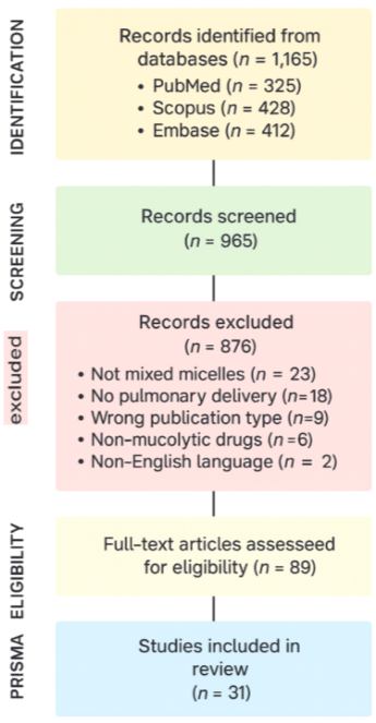 Studies were eligible if they reported original in vitro, ex vivo, in vivo, or clinical data on mixed (≥2 amphiphiles) micelles—formulated for the pulmonary delivery of any mucolytic drug—or if they compared such micelles with alternative nanocarriers. Exclusions were applied to formulations not based on mixed micelles, those using non-pulmonary delivery routes, conference abstracts, editorials, non-English texts that lacked a full translation, and reviews; however, review articles were still screened for additional references.