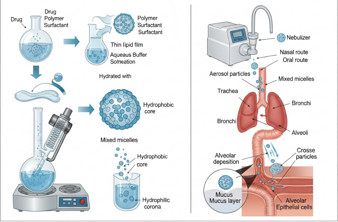 Fig. 3: Schematic representation of mixed micelle preparation via thin film hydration and pulmonary drug delivery pathway
